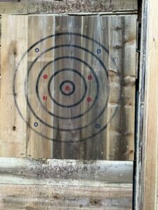 初めてのアックススローイングでしたが何とか片手投げで的に刺さってくれました。